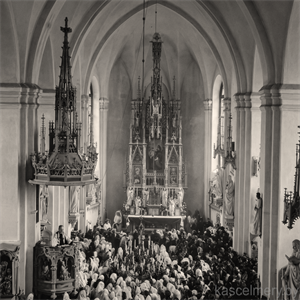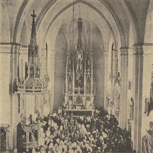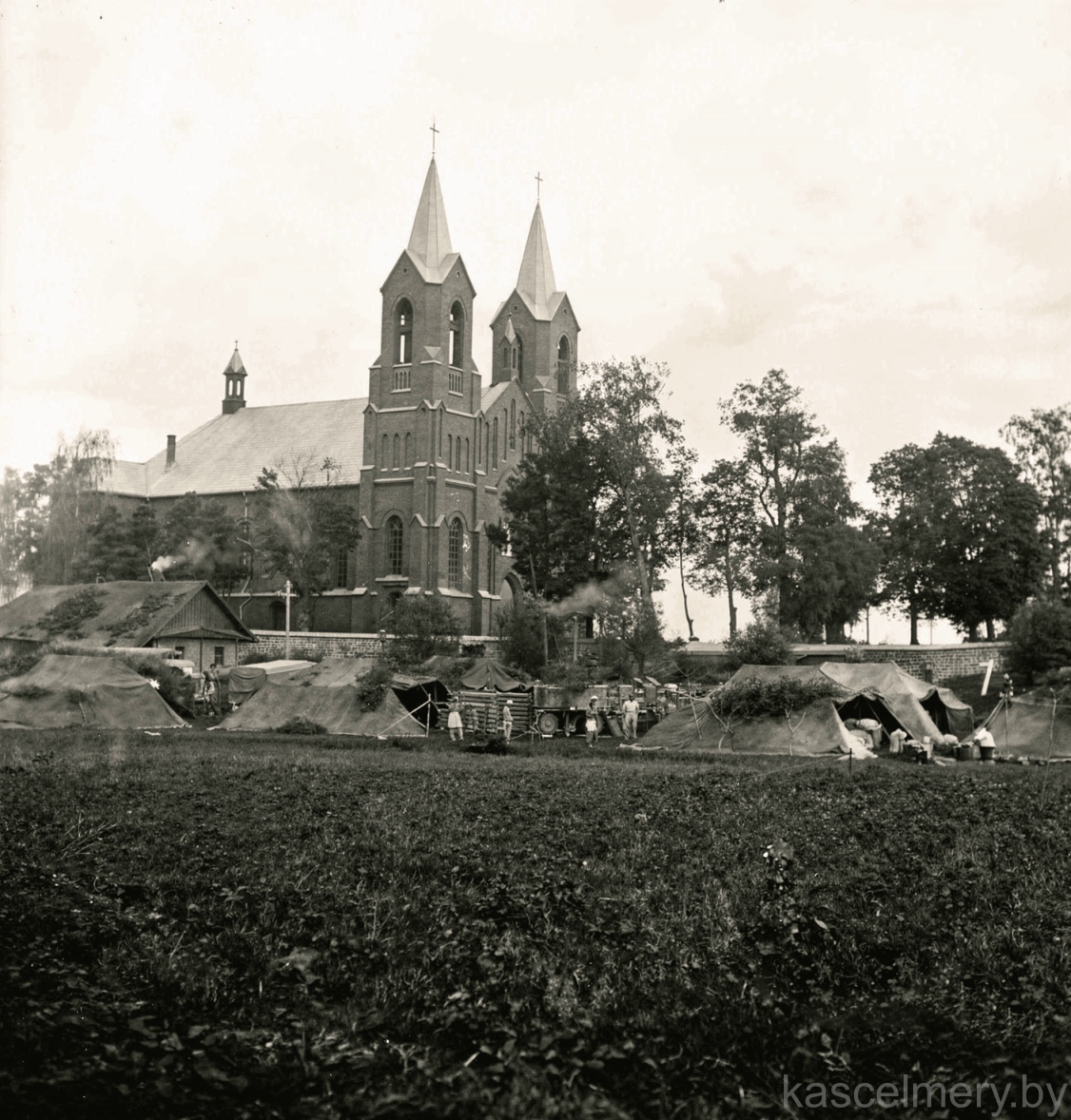 Першы фотаздымак адлюстроўвае будаўніцтва святыні і паромную пераправу праз возера. На фотаздымку бачна, што вежаў яшчэ няма і будаўніцтва не завершана.