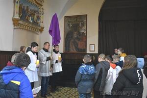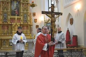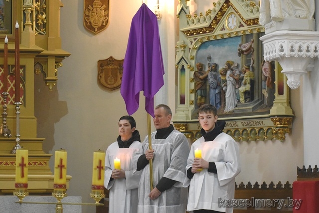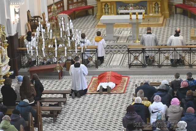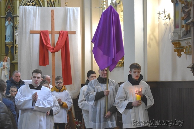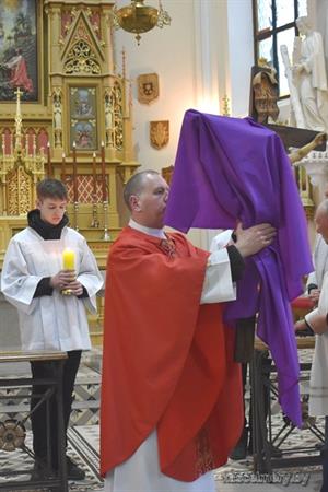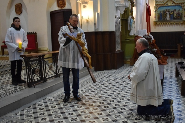 Пасля гэтай малітвы святар уносіць крыж, захінуты ў фіялетавую тканіну, і, узняўшы яго, паступова здымае тканіну, тройчы спяваючы: «Вось дрэва крыжа, на якім памёр Збаўца свету». Вернікі адказваюць: «Пойдзем з паклонам».