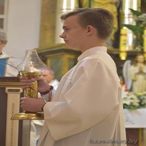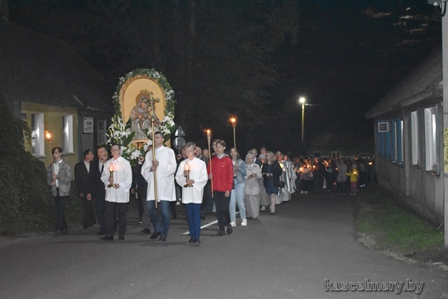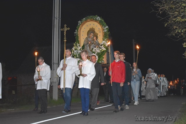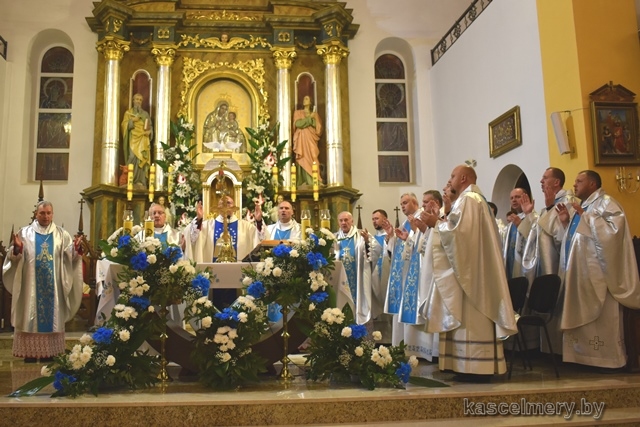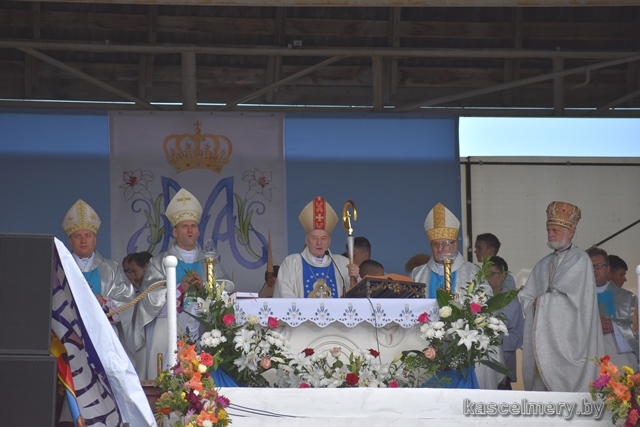 Апоўначы распачалася святая Імша перад абразом Маці Божай, якую цэлебраваў біскупскі вікарый для горада Магілёва і Магілёўскай вобласці біскуп Аляксандр Яшэўскі SDB. Яго Эксцэленцыя ў сваёй гаміліі звярнуў увагу на тое, што праз Марыю мы хутчэй за ўсё можам наблізіцца да Пана Бога. Існуе шмат разнастайных набажэнстваў і практык на ўшанаванне Маці Божай, таму кожны можа выбраць тое, што яму да спадобы.