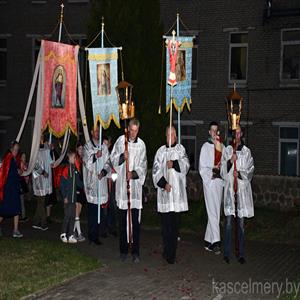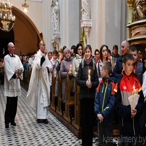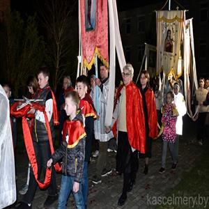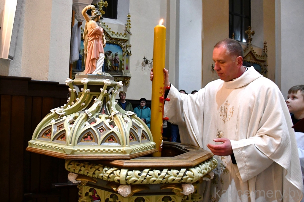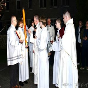 Пробашч парафіі ксёндз Андрэй Кулік у сваёй гаміліі падкрэсліў, што літургія Вігіліі пасхальнай напоўнена шматлікімі сімваламі, такімі як агонь, пасхальная свечка, вада. Усе яны кіруюць нашу ўвагу на Хрыста, якога праз гэтыя сімвалы Касцёл нам паказвае як святло свету і жывую ваду. Словы Езуса, у якіх Ён сам называе сябе святлом свету і кажа, што кожны, хто ідзе за Ім не загіне ў цемры, а вада, якую Ён дае, натоліць смагу чалавека і той ужо не будзе прагнуць, найбольш раскрываюцца ў Пасхальнай літургіі, якую мы зараз перажываем.
